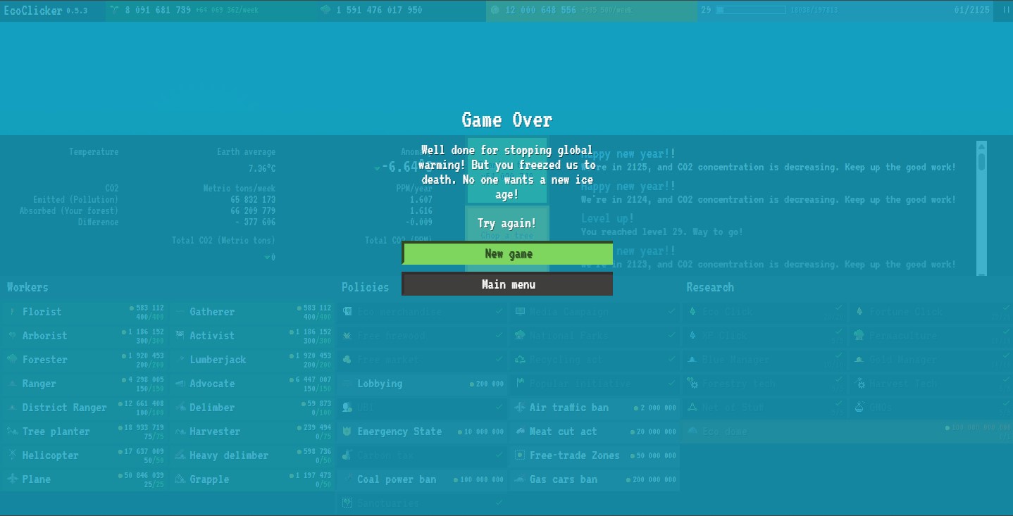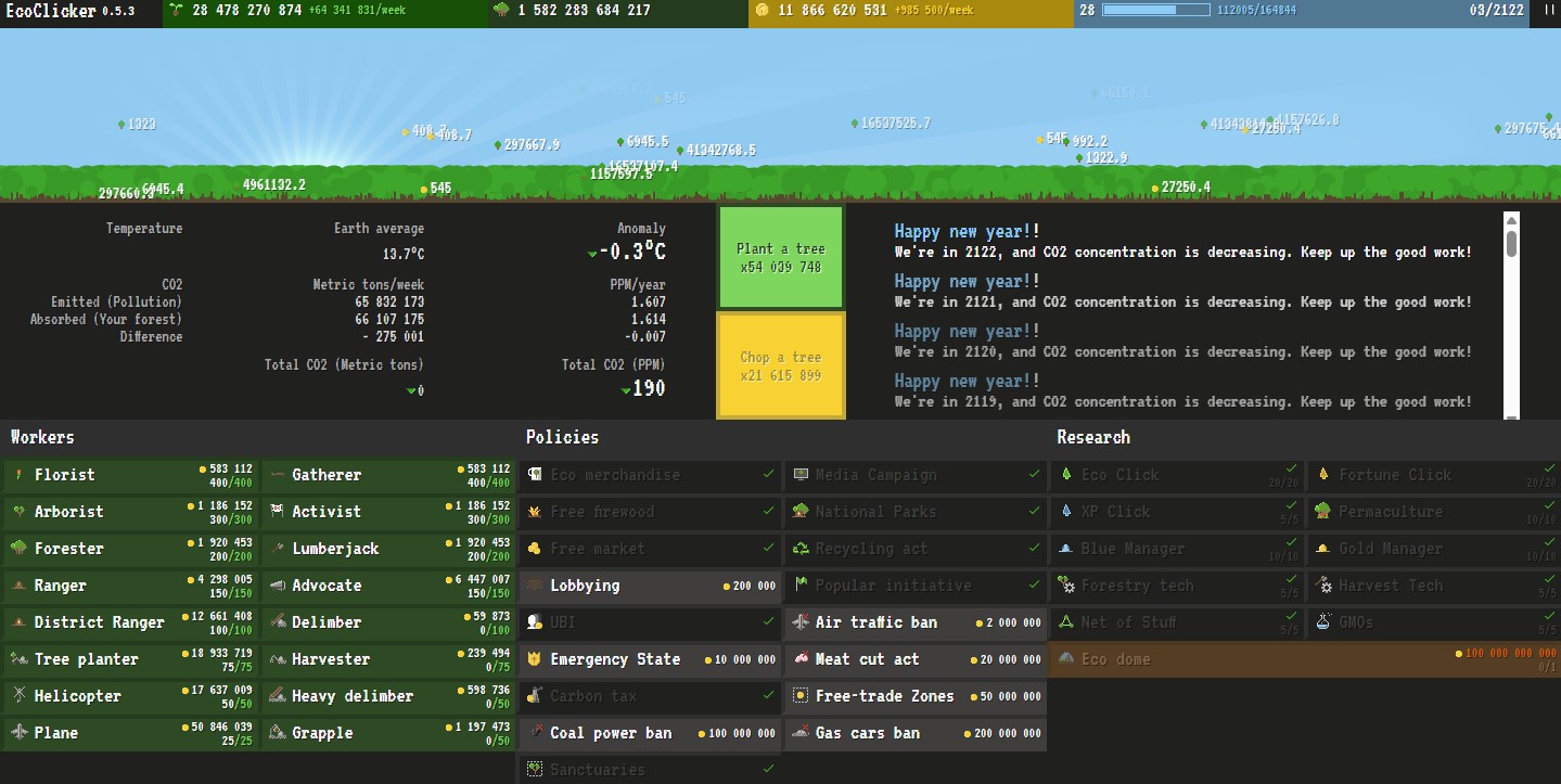 Other than that, in the last month I looked at the code of Ecoclicker, and I wish I could do something better at the time. There is not much to do with it, the only way to improve the game is to add new kind of workers, policies and researches. The code doesn't look sufficiently flexible to change the game mechanisms. Adding new workers, policies and such would be interesting, but I feel the core gameplay is wrong.